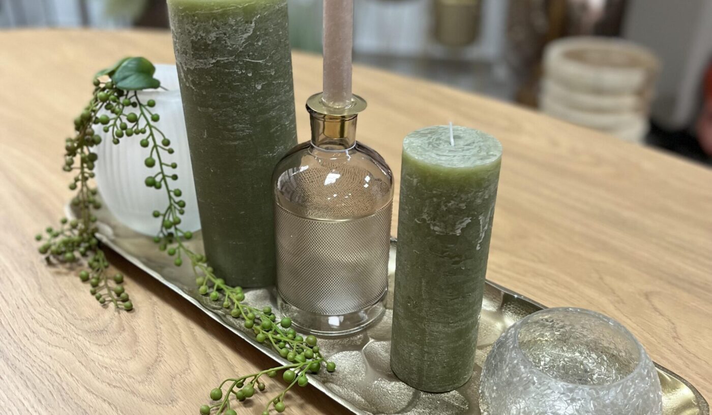 Kolejną propozycją zarówno na stół jadalniany, jak i stolik kawowy w salonie jest wykorzystanie tacy i ustawienie na niej dekoracyjnych świec o różnych wysokościach, obok dekoracyjnego tealighta, drobnego wazonika z sukulentem bądź żywą roślinką czy kwiatem.