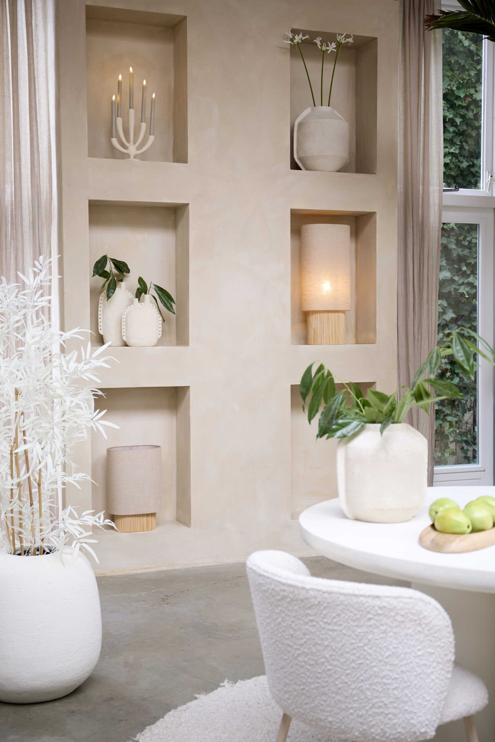 Ta lampa to harmonijne połączenie surowej tekstury drewna z delikatnością lnu. Wysoki, smukły klosz w odcieniu naturalnego beżu doskonale rozprasza światło, tworząc w pomieszczeniu przytulną, intymną atmosferę. Elementem przyciągającym wzrok jest cylindryczna, ryflowana podstawa, która dzięki pionowym żłobieniom nadaje oprawie rytm i nowoczesny, architektoniczny sznyt. Idealnie sprawdzi się jako wysoka lampa na komodę w salonie lub efektowne oświetlenie do sypialni w stylu japandi.