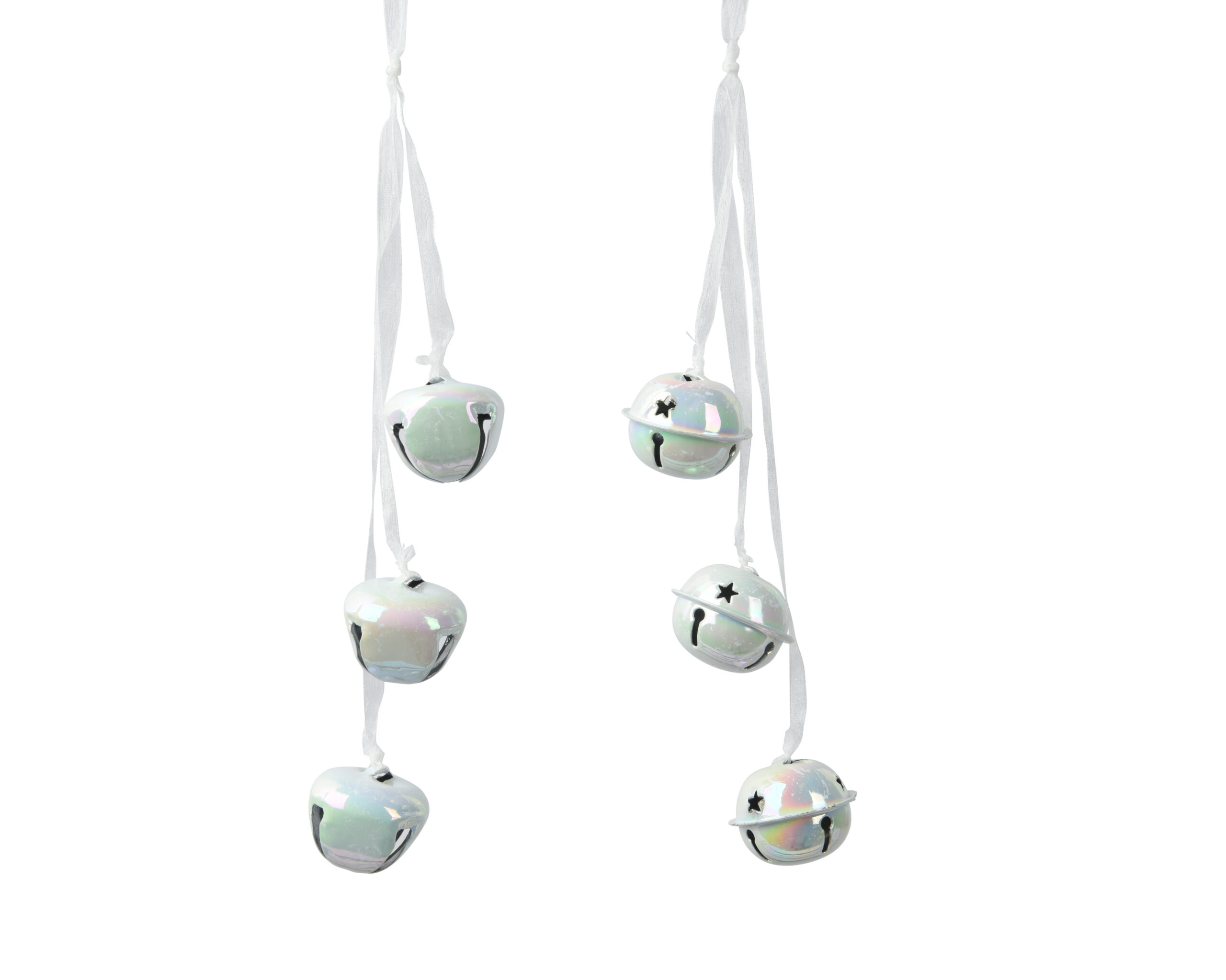 Elegancka zawieszka świąteczna z trzema metalowymi dzwoneczkami w kolorze białym z perłowym połyskiem to subtelna i stylowa dekoracja, która wprowadzi do wnętrza wyjątkowy, świąteczny klimat. Dzwoneczki zawieszone są na delikatnej, dopasowanej kolorystycznie wstążce, a całość ma długość 28 cm.