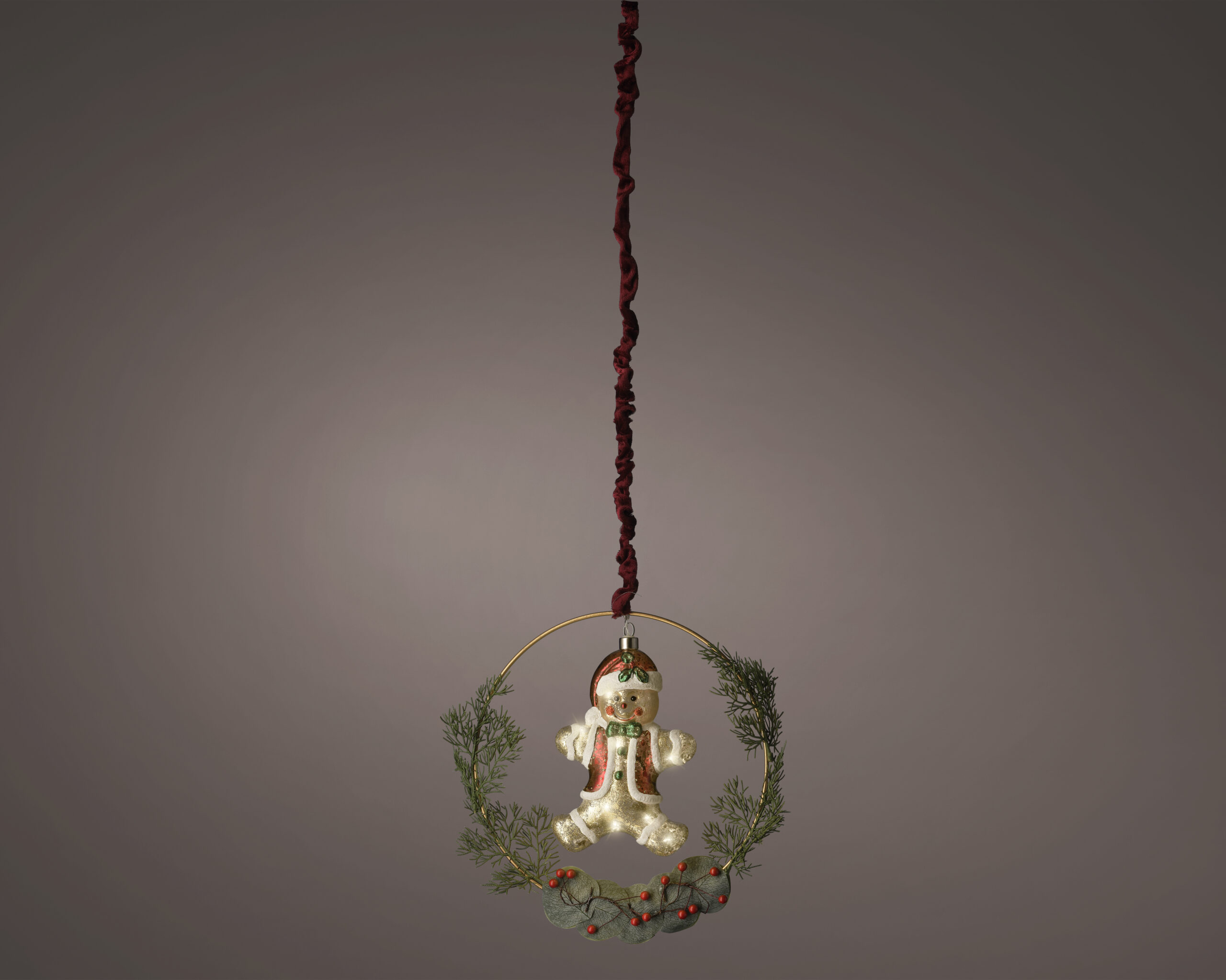 Ta efektowna świecąca ozdoba świąteczna o średnicy 26 cm zachwyca detalami. Wbudowane, dyskretne diody LED delikatnie podświetlają szklanego bałwanka i wianek, tworząc przytulny, świąteczny nastrój po zmroku.